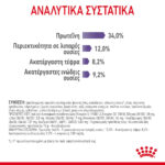 Συστατικά (%) • Αφυδατωμένη πρωτεΐνη πουλερικών, φυτικές ίνες, καλαμπόκι, σιτάρι, γλουτένη σίτου*, γλουτένη αραβοσίτου, υδρολυμένες ζωικές πρωτεΐνες, ζωικά λίπη, ρύζι, πολτός τεύτλων, προϊόντα ζύμης, μέταλλα, σογιέλαιο, ιχθυέλαιο, φλοιοί και σπόροι ψυλλίου, φρουκτο- ολιγοσακχαρίτες.