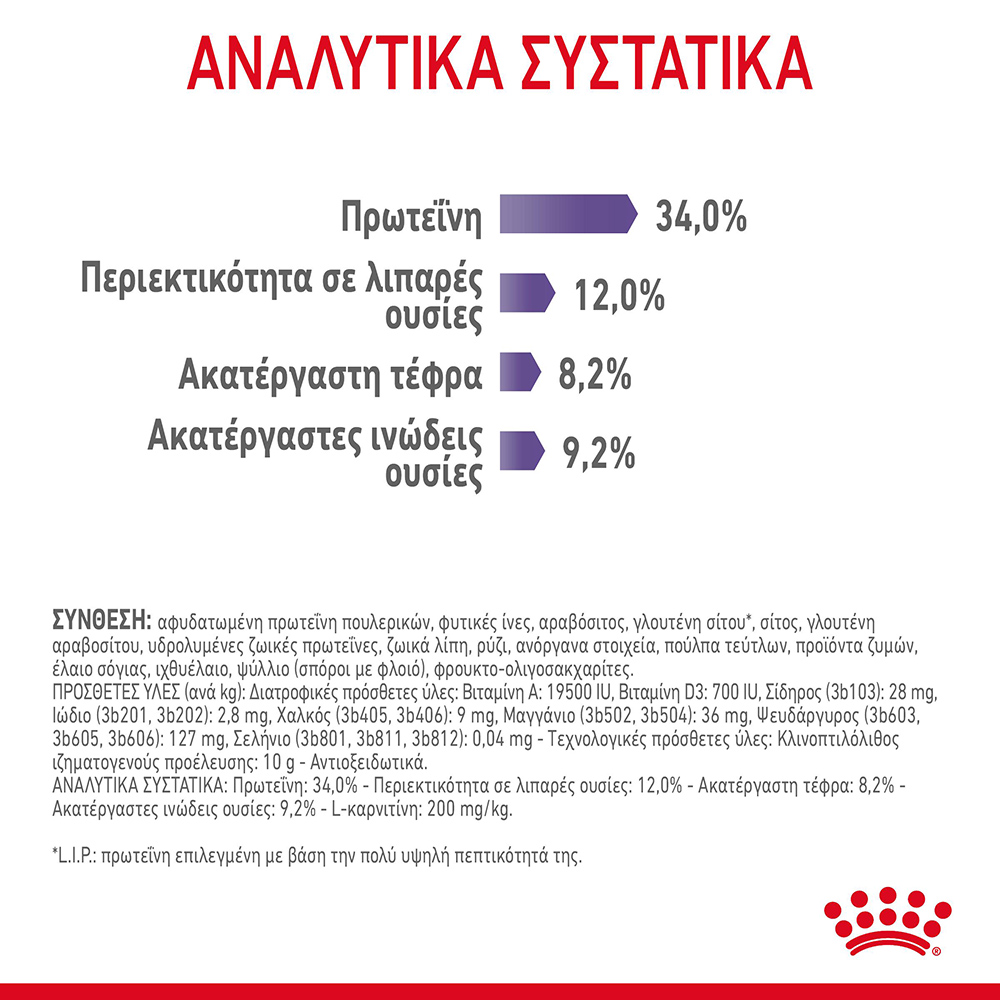 Αναλυτικά συστατικά (%) • Πρωτεΐνες: 34,0%, Περιεκτικότητα σε λιπαρά: 12,0%, Ακατέργαστη τέφρα: 8,0%, Ακατέργαστες ίνες: 9,2%, L-καρνιτίνη: 200 mg/kg. * LIP: πρωτεΐνη που επιλέγεται για την πολύ υψηλή πεπτικότητα.